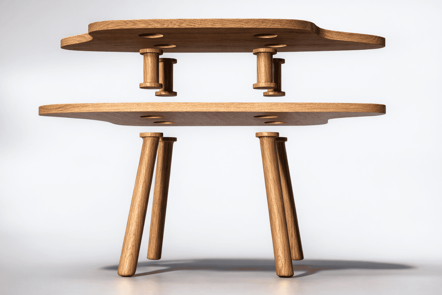 EIRA is an independently developed solid oak coffee table exploring structural balance within an asymmetrical two-plane configuration. Two horizontally separated surfaces are connected through vertical supports and angled legs, ensuring controlled load transfer and lateral stability. The project focused on proportion control within a reduced geometric language, developed through 1:5 scale modeling and digital refinement.